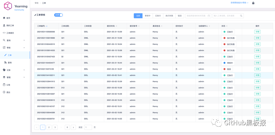 Yearning 使用 Go 语言开发,同时 Yearning 不依赖于任何第三方 SQL 审核工具作为审核引擎,内部已自己实现审核/回滚相关逻辑,仅依赖 Mysql 数据库存储相应的流程和使用情况。所以 Yearning 安装也很简单,只需要下载官方的二进制包即可启动,开箱即用。以下是 Yearning 的几个常用操作界面: