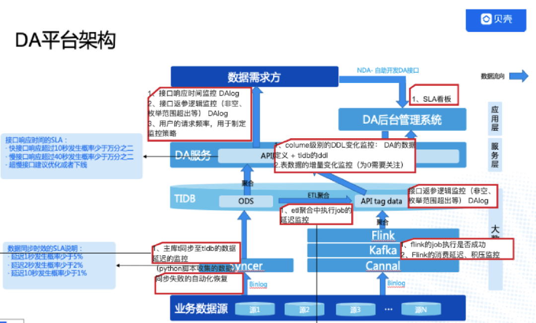 贝壳金服持续多年深耕居住场景,积累了丰富的中国房产大数据。贝壳金服以金融科技为驱动,利用AI算法高效应用多维海量数据以提升产品体验,为用户提供丰富、定制化的金融服务。在贝壳数据组的数据服务中,Flink 实时计算用于典型的维表 Join:1. 首先,使用 Syncer (MySQL 到 TiDB 的一个轻量级同步工具)采集业务数据源上的维表数据同步到 TiDB 中。2. 然后,业务数据源上的流表数据则通过 Canal 采集 binlog 存入 kafka 消息队列中。3. Flink 读取 Kafka 中流表的变更日志,尝试进行流式 Join,每当需要维表中的数据时,就去 TiDB 中查找。4. 最后,Flink 将拼合而成的宽表写入到 TiDB 中,用于数据分析服务。
