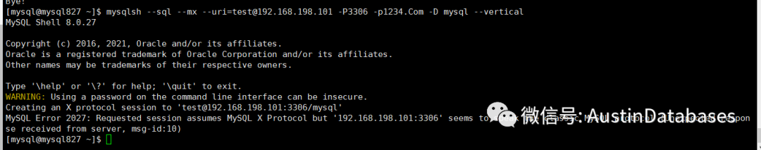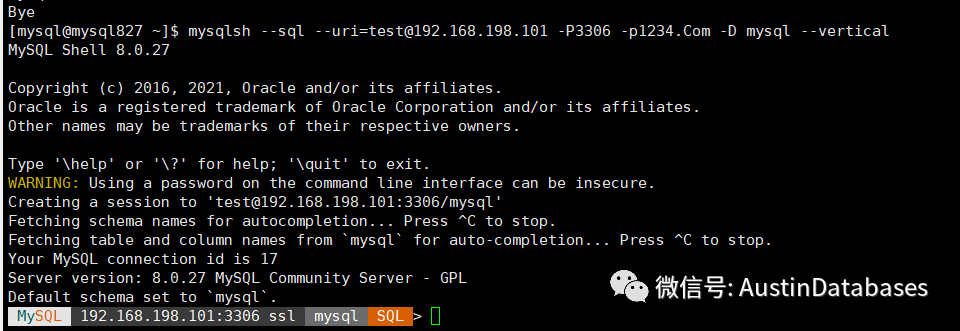 mysqlsh --sql--uri=test@192.168.198.101 -P3306 -p1234.Com -D mysql –vertical
