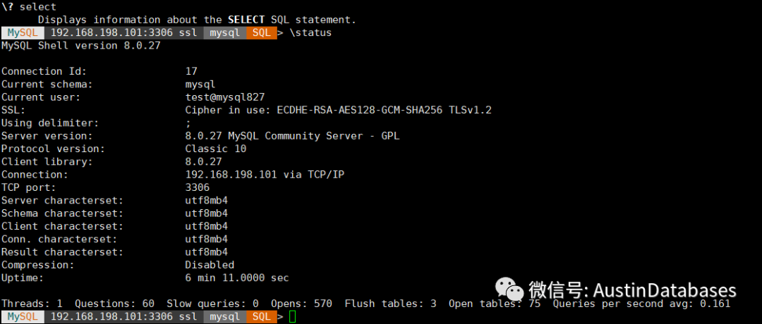 5 通过SQL方式连入到MYSQLSHELL 后我们通过第一个简单的命令就可以获得我们的MYSQL上的一些统计信息,\status