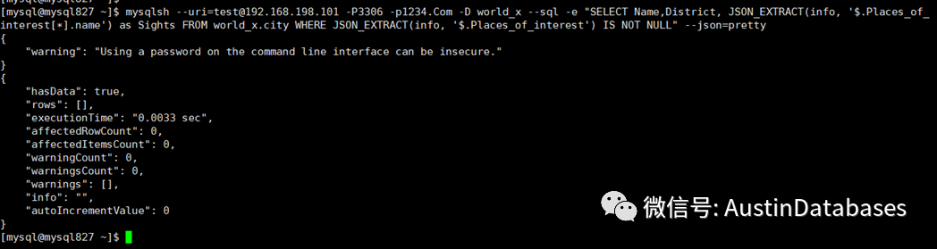 mysqlsh--uri=test@192.168.198.101 -P3306 -p1234.Com -D world_x --sql -e "SELECTName,District, JSON_EXTRACT(info, '$.Places_of_interest[?].name') as SightsFROM world_x.city WHERE JSON_EXTRACT(info, '$.Places_of_interest') IS NOTNULL" --json=pretty