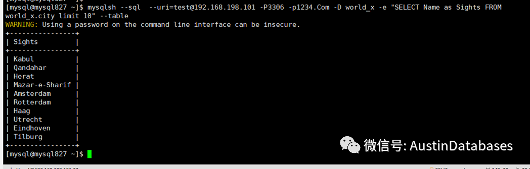 mysqlsh--sql --uri=test@192.168.198.101 -P3306-p1234.Com -D world_x -e "SELECT Name as Sights FROMworld_x.city limit10" --table