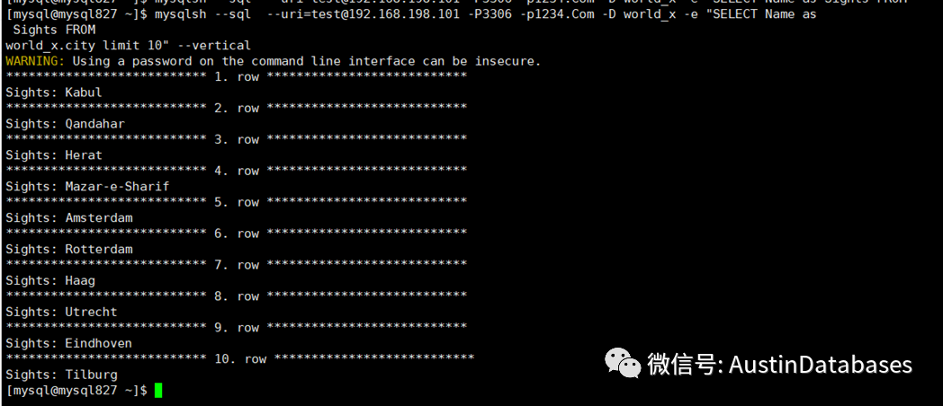 mysqlsh--sql --uri=test@192.168.198.101 -P3306-p1234.Com -D world_x -e "SELECT Name as Sights FROMworld_x.city limit10" – vertical