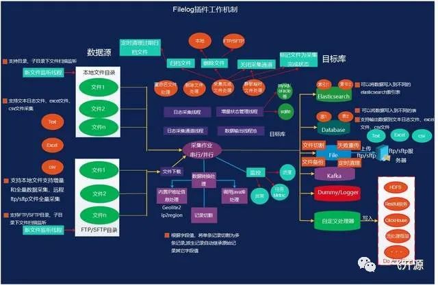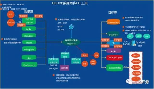 database/mongodb/Elasticsearch/kafka/hbase/本地或者Ftp日志文件源数据,经过数据转换处理后,再推送到目标库elasticsearch/database/file/ftp/kafka/dummy/logger。