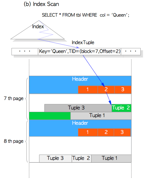 索引元组的结构是Key=xxx,TID=(block=xxx,Offset=xxx),其中key代表索引的键值,也就是索引指向真实元组的字段值,TID是一个指向数据元组的指针数据结构,它包含两部分,第一部分是block块号,也可以叫页面号,通过页面号定位到数据所在页面,第二部分是offset,代表元组在该页面的偏移量,这个偏移量实际上就是页面头结构中的linepointer的值,它是页面内指向真实元组的指针。