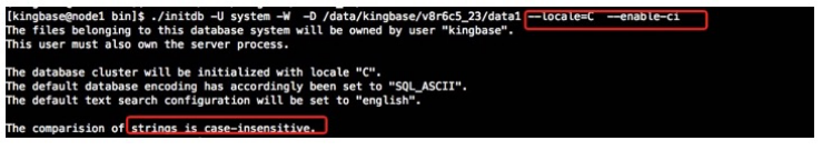 [kingbase@node1 bin]$ ./initdb -U system -W -D /data/kingbase/v8r6c5_23/data1 --locale=C --enable-ci