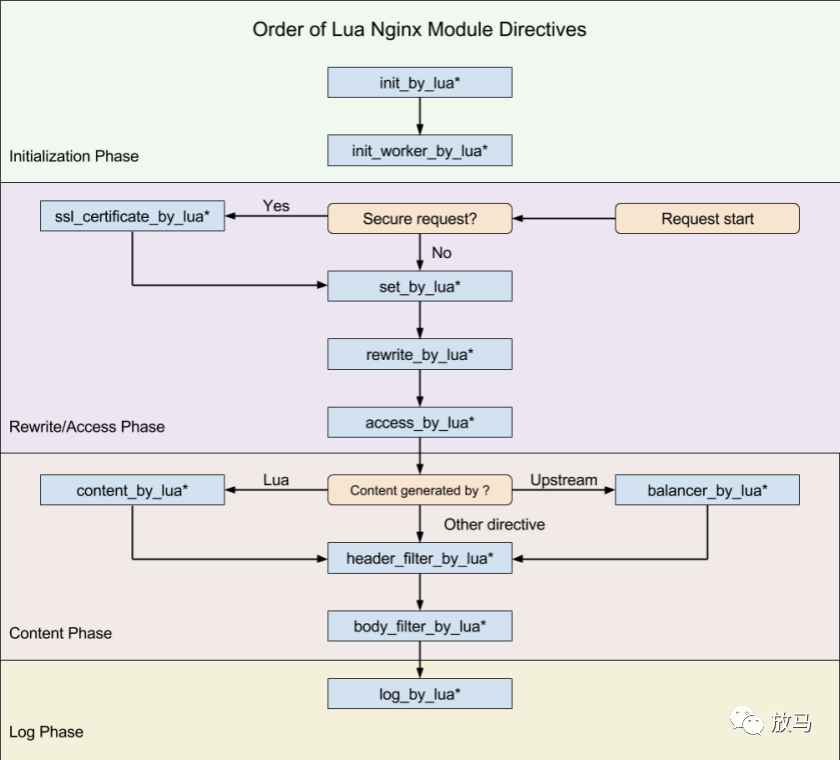 Tengine/Openresty的nginx-lua模块在nginx中预设了lua埋点,nginx在执行对应的模块时,会先调用对应的lua埋点,然后继续向下执行。