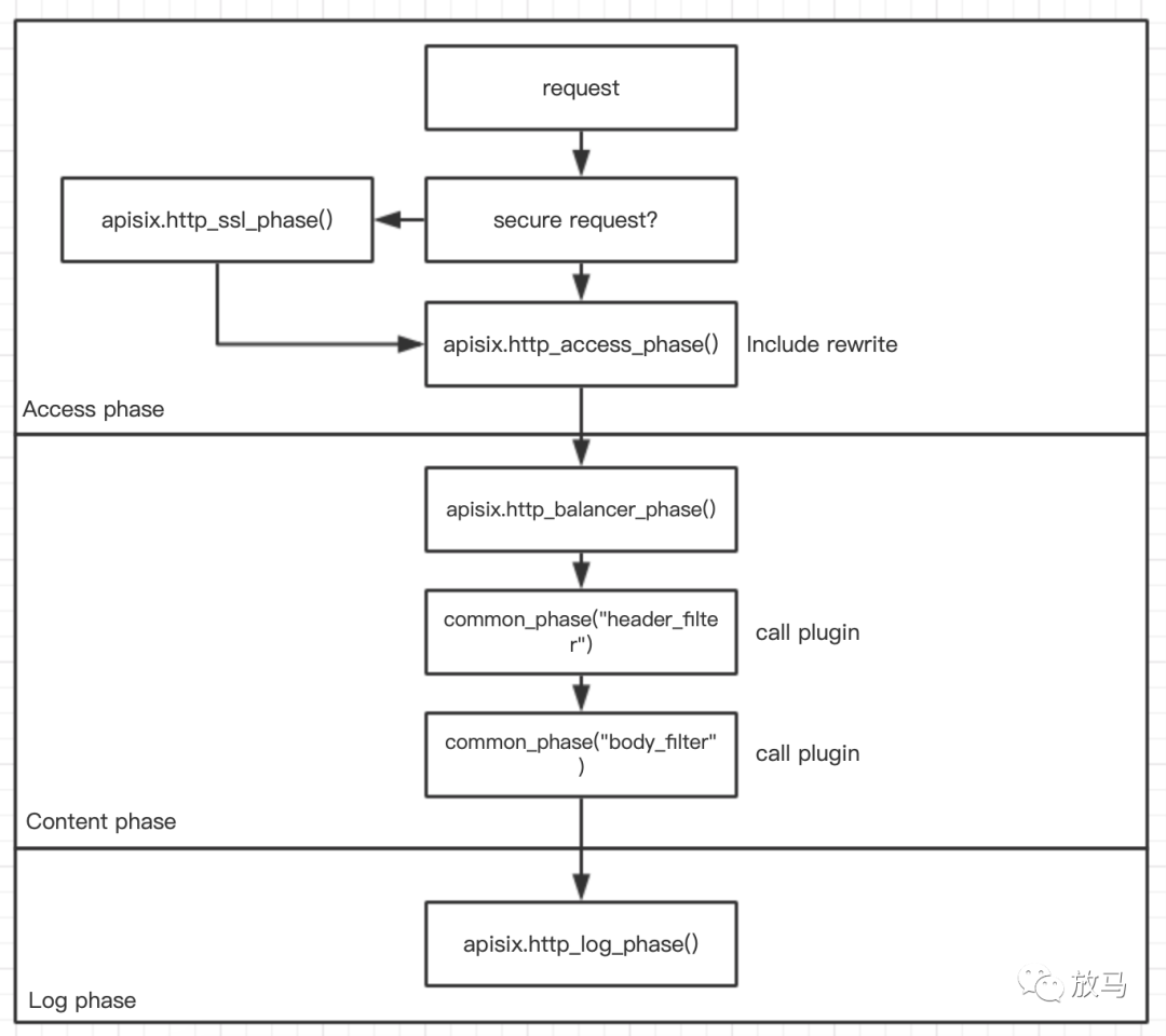 http_ssl_phase> router.router_ssl.match_and_set(api_ctx)> 设置上下文> radixtree_router:dispatch获取证书,如果获取不到则返回failed to fetch SNI> set_pem_ssl_key 清除默认证书,并使用etcd中的证书替换http_access_phase> 调用全局rewrite插件> 调用全局access插件> radixtree_uri match域名、路由匹配> 如果是grpc则转发到grpc逻辑处理> 获取service并合并service配置> 解析后端域名> 调用rewrite插件> 合并consumer配置,做身份认证> 调用access插件http_balancer_phase> 如果有balancer插件,则调用balancer插件。> 否则调用默认的balancer插件。common_phase(header_filter)> 调用header_filter插件common_phase(body_filter)> 调用body_filter插件http_log_phase> 调用log插件> 清理tablepool