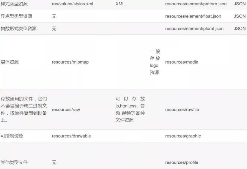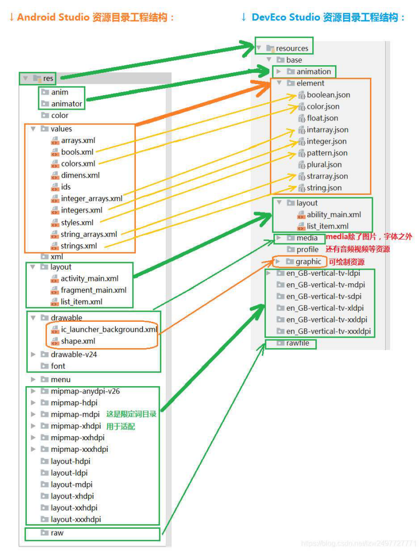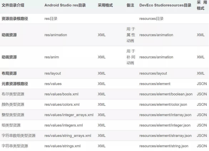安卓是 res/values 目录,这里是 resources/element 目录。安卓 raw 目录,这里用 rawfile 目录。