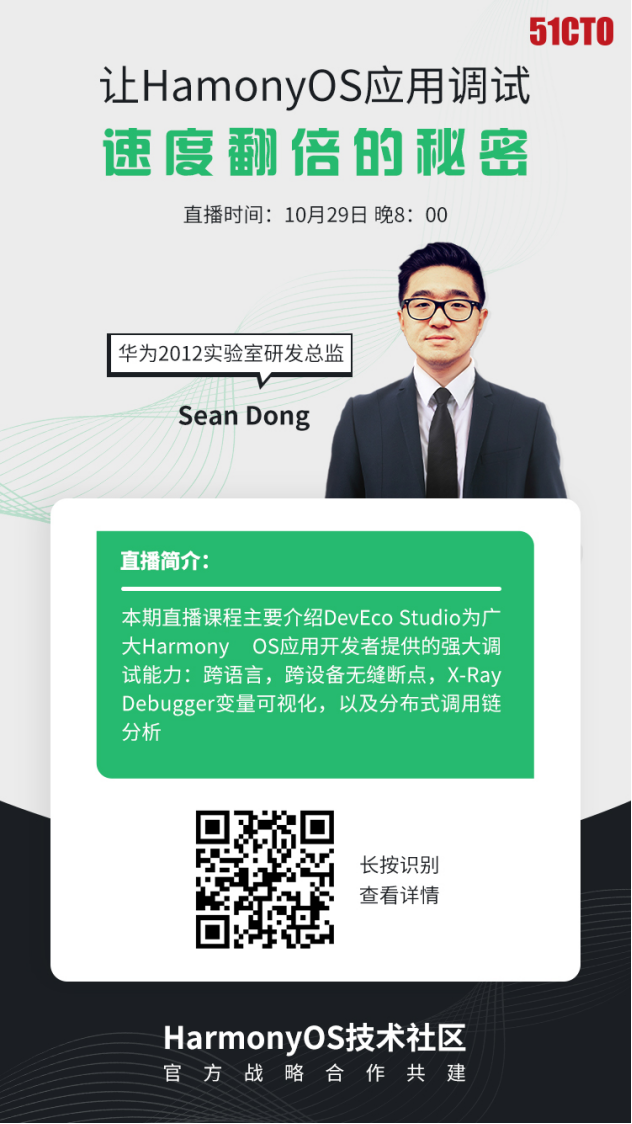 10 月 29 日(本周四)晚 8 点,我们特别邀请到华为 2012 实验室研发总监 Sean Dong 来到直播间,为大家深入讲解《让HamonyOS应用调试速度翻倍的秘密》。