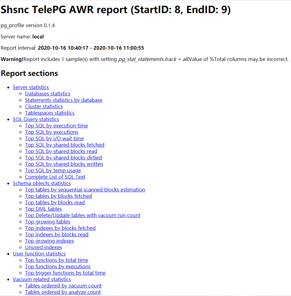 psql -qtc "select profile.get_report(8,9)" --output awr_report_postgres_8_9.html |