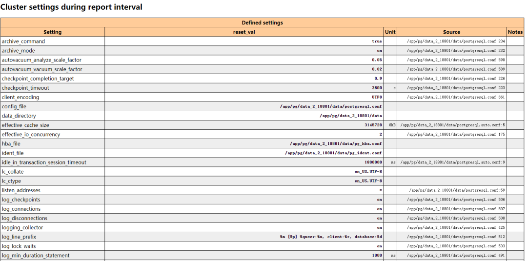 第一部分是服务器统计。包含了数据库在此快照期间的统计信息,例如事务数、内存命中率、元组的操作统计等、数据库的调用次数等、数据库聚簇的统计信息,表空间的增长等等。
