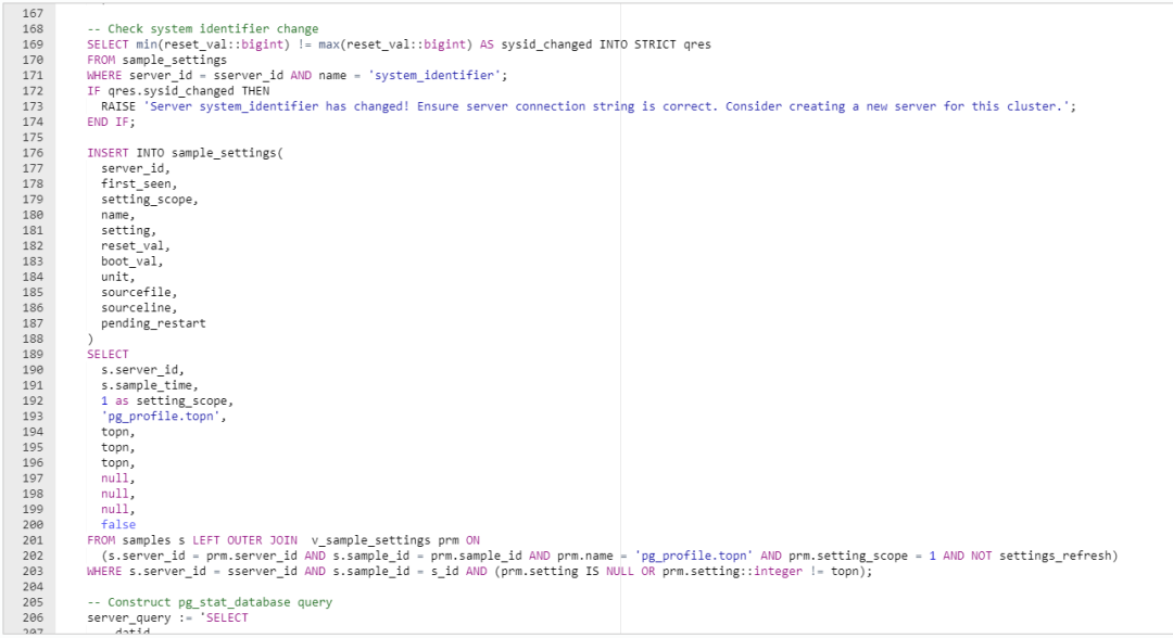 pg_profile的介绍就到这里,相对于Oracle的awr报告还是有一定的差距的。但是好在开源软件可以自行进行增强。当前执行快照的函数是take_sample(),当执行该函数的时候,会采集相关信息存入我们创建的schema的相关表中,如下图所示: