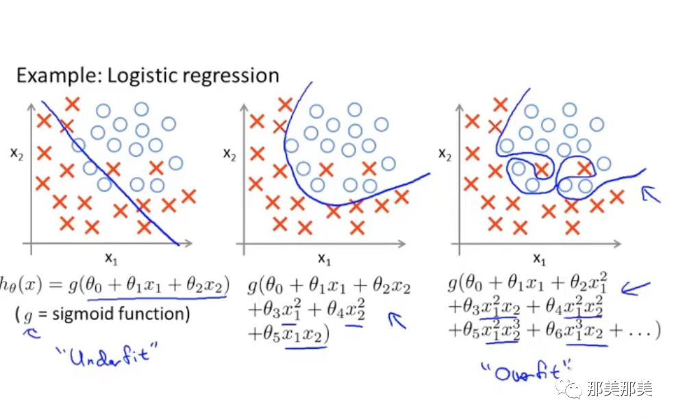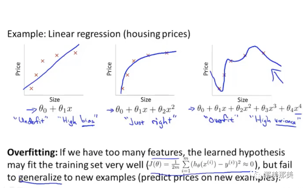 过拟合即训练出来的h𝝷值能够将所有的样本进行区分,所得到的曲线极度扭曲此时J𝝷值趋近于0,无法很好地泛化到新的样本数据.