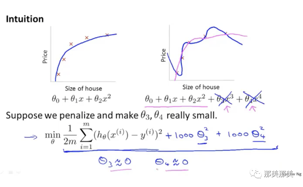 假设我们在J𝝷在后面加上惩罚变量1000 * 𝝷3^2, 1000 * 𝝷4^2,如果此时我们需要J𝝷得到最小化的值,那么我们只有令𝝷3、𝝷4趋于0,则这个时候的拟合就是一个曲线.𝝷3和𝝷4的值越小,此时越不容易出现过拟合的情况,曲线也就更平滑.