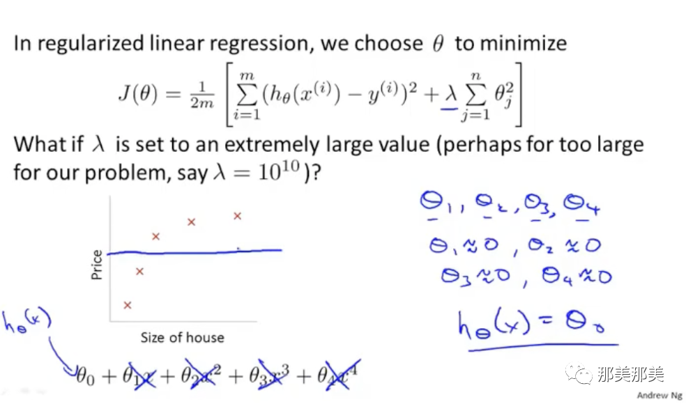 如果设置正则化参数值过大,会导致出现𝝷1至𝝷4的值趋近于0, 才能使J𝝷的值最小化,则此时就出现了欠拟合的情况,因为此时的是𝝷0的值,即一条平行线.