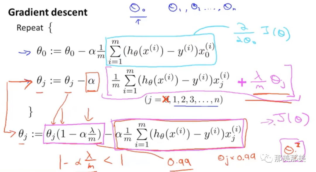 为什么没有了𝝷^2 的表示,因为梯度下降的时候是对J𝝷的求偏导. 正则化函数是从𝝷1开始的,所以此时需要单独表示出𝝷0的过程.