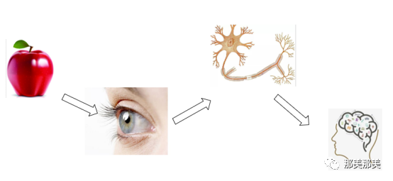 以识别物体为例,人类的视觉存在一定的模式,我们能看到一个苹果并且能够认识它,是因为我们的眼睛视网膜接收到了光纤,并将它转化成了电信号,然后由神经元从中找出颜色、形状、方向、边缘、材质等相关的信息,最红大脑对信息进行处理分析,给出了苹果的答案。