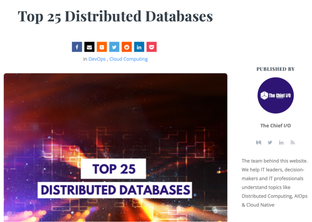 近日,技术网站 The Chief I/O 发布 “Top 25 Distributed Databases” 一文,详细介绍目前分布式数据库开源及商业解决方案中的最佳选择,Apache ShardingSphere 与 Apache Ignite、Apache HBase、AWS Simple DB、TiDB 等进入报道视野。The Chief I/O 网站聚焦分布式计算,AIOps 以及云原生话题以服务 IT 业领袖及专家。