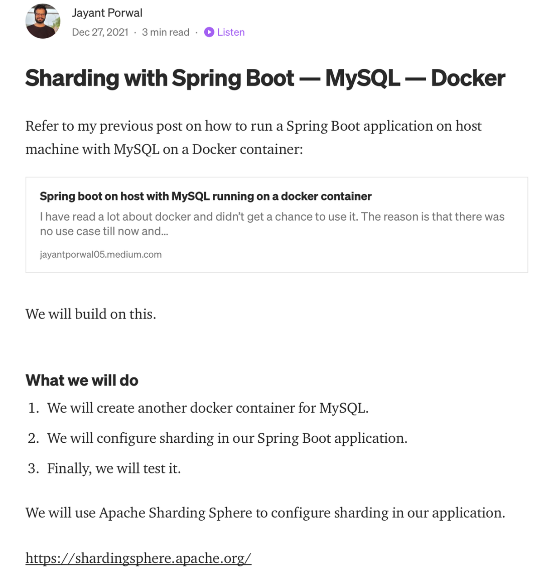 Java 开发者 Jayant Porwal 在 Medium 平台详解如何借助 Apache ShardingSphere 完成 Spring Boot - MySQL - Docker 分片。