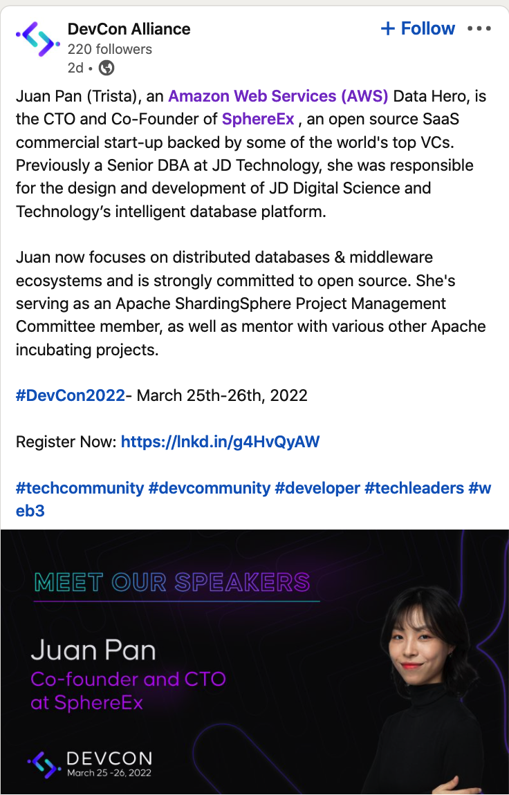 Apache ShardingSphere PMC 潘娟将于 2022 年 3 月 25 - 26 日出席 DevCon 2022,与全球开发者、技术领袖和科技公司交流探讨开源社区与技术前景,分享她的技术实践经验。