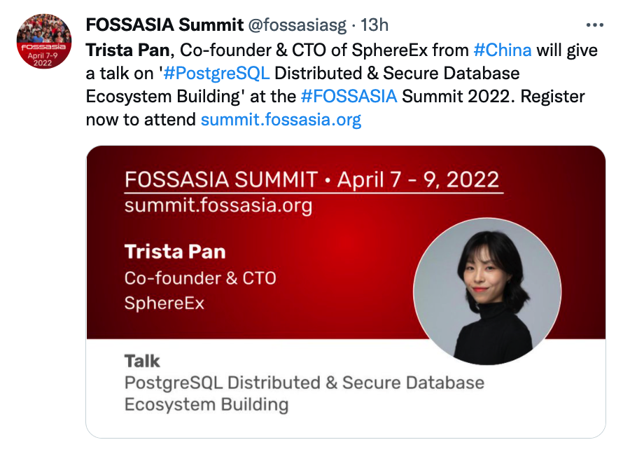 潘娟将于 2022 年 4 月 7 - 9 日在 FOSSASIA SUMMIT 以 “PostgreSQL Distributed & Secure Database Ecosystem Building” 为主题进行演讲。该年度峰会由 FOSSASIA 和 OpnTec 合作组织,面向亚洲与全球开发人员社区一起开发开源软硬件解决方案,来自 AWS、Microsoft、Oracle、CNCF 等演讲者将齐聚 FOSSASIA SUMMIT 2022。