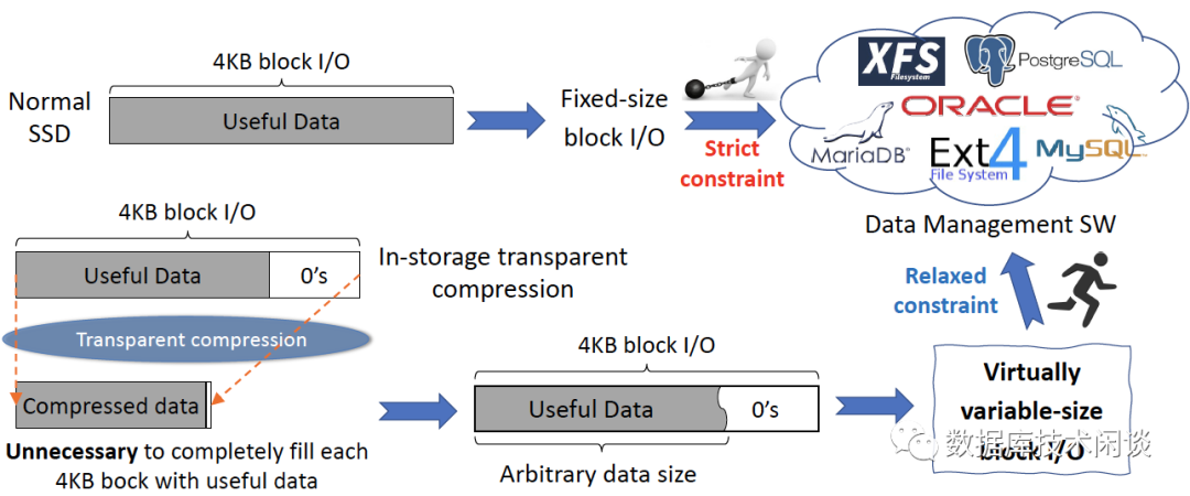 本文转载自 ScaleFlux 官网博客,有删改。本文主要分享当 SSD 内部开启透明压缩时,给传统基于定长块 I/O 设计的应用软件(主要指数据库)带来了一些意想不到的用法,供数据库内核开发者和运维参考。