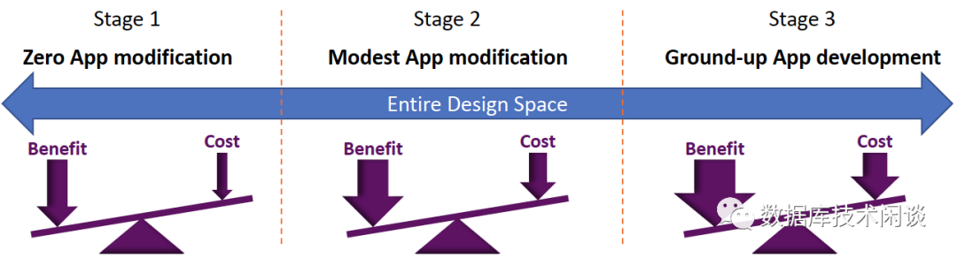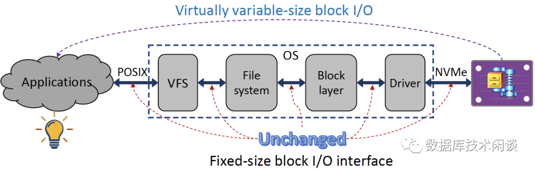 在过去的 40 年里,所有数据管理软件基础设施都是基于定长块块 I/O 约束构建的。直观地说,随着存储中透明压缩支持的实际变长的块 I/O 的到来,也迎来了重新思考数据管理软件(主要指数据库)的设计和执行的机会。在这种情况下,如图 2 所示,所有创新和修改都完全限制在用户应用程序域内,而整个 I/O 堆栈保持不变。显然,它可以大大降低开发成本和使用障碍,这是终端用户非常希望的。
