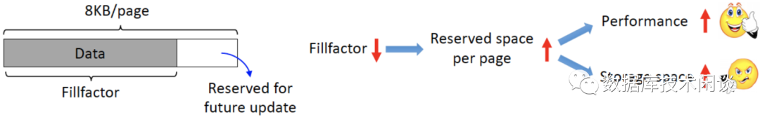 上面揭示了提升 TPS 性能和降低存储空间之间的平衡思路:当将数据加载到 PostgreSQL 时,如果不完全填充 B+ Tree 页,预留一部分剩余余空间来容纳之后的更新,这样可以提高 TPS 的性能。然而,这同时增加了更多的 B+ Tree 页,从而消耗了更多的存储空间。如图 4 所示,PostgreSQL 允许用户通过使用一个名为填充因子(Fill Factor)的参数配置来实现这样的平衡。通过在10到100之间调整填充因子的百分比,来控制B+ Tree 页填充量。它的默认值是 100,即每个页面可能都写满了新增的行,就不会为之后的更新预留任何空间。