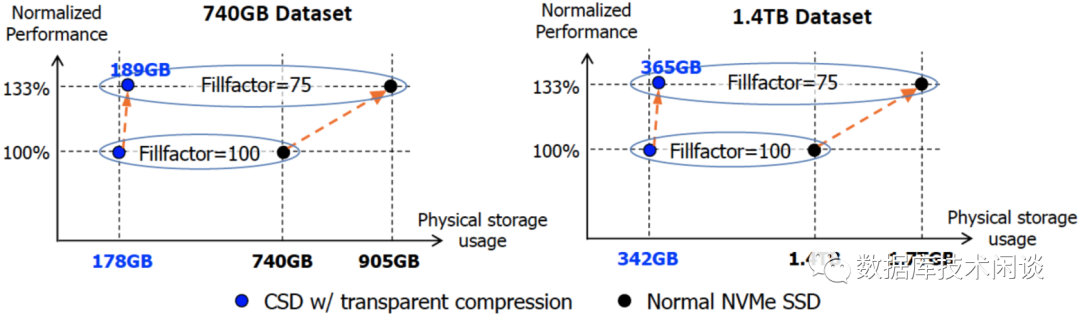 为了进一步验证这一设想,我们使用 Percona 序列台-TPCC OLTP基准测试在 PostgreSQL 上进行了实验。我们使用了一个具有 32核 3.3GHz Xeon CPU 的服务器,然后考虑了两种不同的数据集大小:740GB 和 1.4TB,并在一个普通的 NVMe SSD 和 CSD2000 上进行了实验(64个客户端线程)。图 5 显示了将填充因子分别设置为 100 和 75 时,TPS 性能和物理存储空间使用情况。在相同的填充因子下,PostgreSQL 在普通的 NVMe SSD 和我们的 CSD2000 上实现了相同的 TPS 。当将填充因子从 100 减少到 75 时,TPS 性能均提高了约 33% 。在 740GB 数据集,Fillfactor 配置为 100 下,CSD 内透明压缩可以将物理存储使用从 740GB 减少到 178GB 。当将 Fillfactor 从100 减少到 75 时,普通 NVMe SSD上的物理存储使用率按比例从740GB 增加到 905GB,而 CSD2000 上的物理存储使用仅从 178GB 略微增加到 189GB 。在 1.4TB 数据集的结果上也可以观察到类似的现象。实验结果清楚地表明,通过简单地配置 Fillfactor 参数,PostgreSQL 可以从 CSD 的透明压缩中显著获益,而无需改变任何源代码。