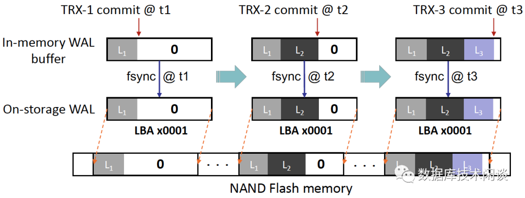 数据库和文件系统几乎普遍使用预写日志(WAL, Write Ahead Logging) 来确保原子性操作和数据持久性。它的基本概念非常简单:在应用到数据文件之前,数据修改会被保存到一个专用的日志区域。在一般情况中,数据修改首先在内存 WAL 缓冲区中以日志形式暂存,然后刷新到 WAL 日志文件中(存储里)。为了最大限度地提高数据持久性,系统会在每次事务提交时执行 WAL 日志文件强制刷盘逻辑(使用 fsync 或 fdatasync 等命令)。为了减少日志引起的存储成本,传统做法总是将日志记录先暂存到内存中的 WAL 缓冲区中,然后再批量写到 WAL 日志文件中。因此,多个连续的 WAL缓冲区刷新可能会写入存储设备上的同一个4KB LBA 块中,尤其是当事务记录明显小于 4KB 或者工作负载并发性不高时。这可以在图 6 中说明:假设三个事务 TRX-1、TRX-2 和 TRX-3(具有日志记录 L1、L2 和 L3)分别在时间 t1、t2 和 t3 提交。如图 1 所示,在时间 t1,4K 数据 [L1, 0] 从内存中的 WAL 缓冲区刷新到存储设备上的LBA 0x0001,其中 0 表示空数据(\0)。稍后,日志记录 L2 被附加到 WAL 缓冲区中,并且在时间 t2,4KB 数据 [L1, L2, 0] 被刷新到存储设备上相同的 LBA 0x0001。类似地,在时间 t3,4KB 数据 [L1, L2, L3, 0] 被刷新到存储设备上相同的 LBA