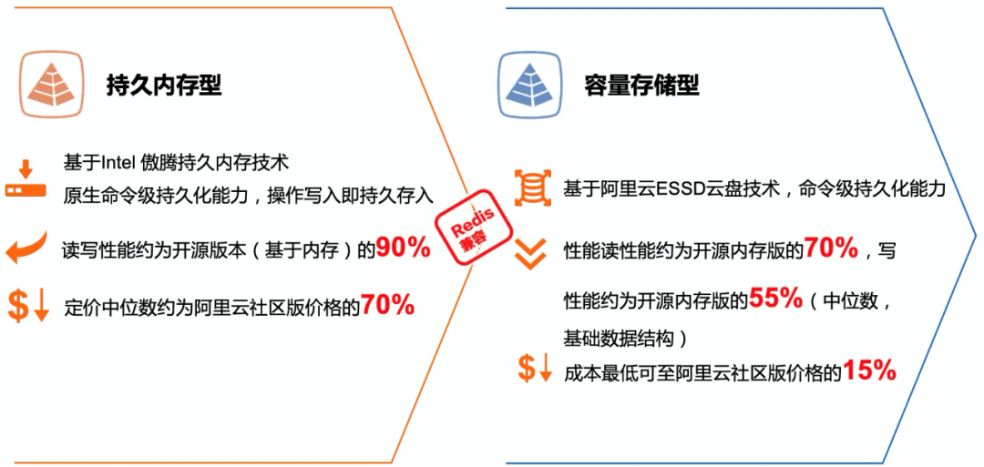 持久内存型是基于Intel 傲腾(AEP)持久内存技术,兼容绝大部分Redis数据结构和命令,并利用AEP的App Direct模式实现了高性能下的命令级持久化能力。在性能测试中其读写性能约为开源Redis的90%,而在定价上,由于新硬件带来的成本红利,该产品形态的定价是阿里云社区版Redis价格的70%左右,整体性价比更高,适用于要求高吞吐、低延迟同时对数据可靠性要求高的热数据存取场景。