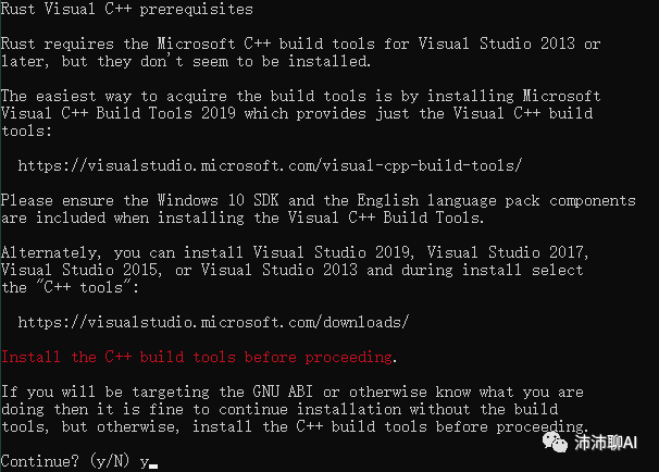 如图1所示,我的Windows系统里没有安装Microsoft C++ build tools,因此需要从 https://visualstudio.microsoft.com/zh-hans/visual-cpp-build-tools/ 这里安装,并重新运行Rust的安装文件,如下图: