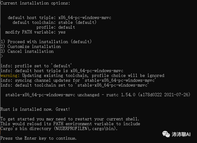 从官网下载Rust安装包并双击打开后,选择默认安装或个性化安装均可。