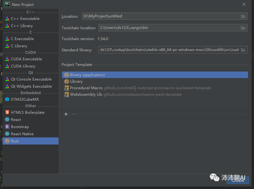 可以看到IDE找到了Rust的toolchain,另外还需要下载一个标准库。点击蓝色的“Download via Rustup”即可。然后就可以新建Rust工程了,如图5: