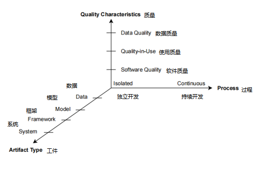 三个维度分别是工件(artifact)类型、过程和质量特性。工件类型考虑了人工智能组件的构成:系统、框架、模型和数据;过程维度根据DevOps原则,判断系统是独立开发还是持续开发;质量特性与工件类型和过程都有关系,比如需要考虑人工智能组件的附加质量特性: