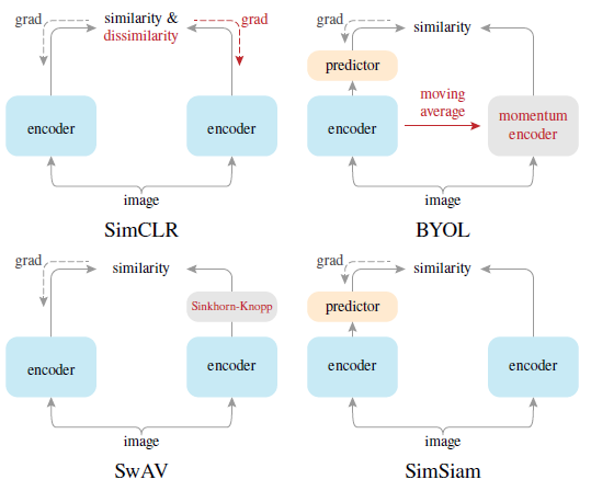 在计算机视觉领域中,对比学习是近年来实现自监督学习最热门的方法之一,目标在于学习同类实例之间的共同特征,区分非同类实例之间的不同之处。由于只需要在抽象语义级别的特征空间上学会对数据的区分即可,使得模型变得更加简单,泛化能力更强。由于孪生网络天然具有建模不变性的特征,而这也是表征学习的核心所在,目前最流行的对比学习框架都是基于孪生网络。为了解决模型坍塌问题,不同模型采取了不同的措施,例如SimCLR加入负样本,SwAV利用聚类,而SimSiam用梯度截断机制同样消除了模型坍塌问题并从侧面验证了孪生网络在对比表征学习中的重要性。作者希望他们的研究能够引起人们对于孪生网络在表征学习中的基本作用的关注。