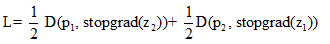 在这里,x2上的编码器的第一项没有接收到来自z2的梯度,但第二项接收到来自p2的梯度(x1也是如此)。