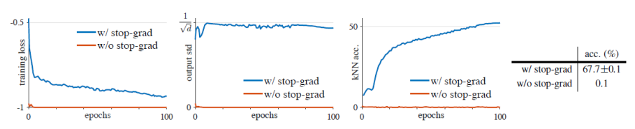 作者还通过理论和实验从侧面验证梯度截断是模型不坍塌的重要原因。理论上解释导入梯度截断操作等同于引入一些虚构的参数(隐变量),让SimSiam的学习机理类似于EM算法,去估算数据增广后的期望值。另外梯度截断的效果对比实验如图4。