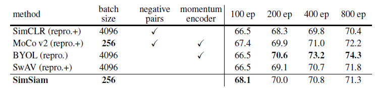表1显示了SimSiam与其他对比学习模型在ImageNet线性分类任务上的精度比较。SimSiam以256批大小进行训练,既不使用负样本也不使用动量编码器。尽管它很简单,还是取得了很有竞争力的结果。在所有方法中,100轮训练周期的预训练的准确率最高,但训练时间越长获得的收益越小。在所有情况下,它的效果都优于SimCLR。BYOL可以算是在SimSiam模型上的一个改进。