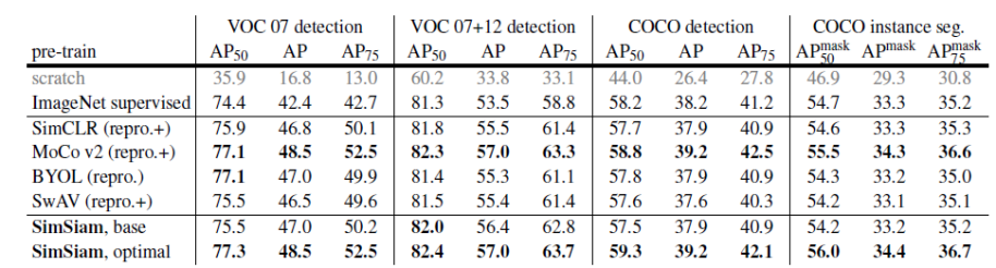 通过将它们转移到其他任务,包括VOC目标检测、COCO目标检测和实例分割,来比较它们的表征质量。在表2中可以看到SimSiam表征可以很好的迁移到ImageNet以外的任务上,迁移模型的性能极具竞争力。另外其他的对比学习方法如SimCLR、BYOL、SwAV等在迁移学习中都是非常成功的,在所有任务中性能都可以超过或与ImageNet有监督下的预训练对应的方法相当。尽管有许多设计上的差异,这些方法的共同结构是孪生网络。这一比较表明,孪生结构是它们普遍成功的一个核心因素。