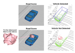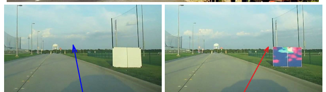 针对自动驾驶的对抗样本目前也已经有丰富的研究成果,例如DeepRoad[4]利用GAN(对抗生成网络)生成较为真实的雨天、雪天的变换图像,从而找到能使自动驾驶DNN出错的场景。DeepBillboard[5]可以生成真实世界中广告牌的对抗样本,引发自动驾驶系统的转向错误。Kevin[6]等人对停车路牌进行物理世界的鲁棒性攻击(在路牌上特定位置进行贴纸),以100%的置信度将右转标志错误分类为指定类别的其他标志。多伦多大学还研究出了针对激光雷达的三维对抗性物体,将该物体放在目标车辆的顶上就能使车辆不被激光雷达探测器发现[7]。