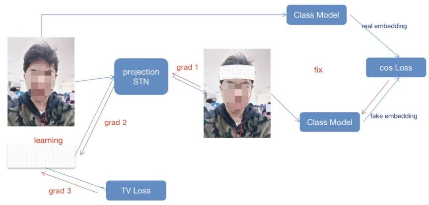 华为莫斯科研究院通过在帽子上粘贴贴纸对目前的最先进(SOTA)的开源人脸识别网络Arcface进行攻击,其攻击结构大致如下图3所示: