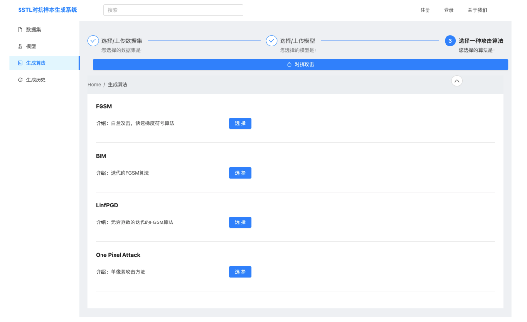 上海计算机软件测评重点实验室(SSTL)自研了对抗样本生成工具,该工具集成了多种对抗样本生成算法,可对常见数据集利用不同算法进行对抗攻击并对模型鲁棒性进行量化评估。该工具还集成了基于现实世界的对抗攻击,目前应用场景为基于深度学习的开源人脸识别模型。