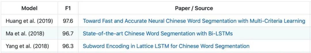 中文分词的常用数据集有Chinese Treebank(CTB6包括78,000个词, 超过128万个中文字符,CTB7包括2448个文档,51447句子,1,196,329个词以及超过190万个中文字符)、CityU、PKU、MSRA,评估指标一般为F值。