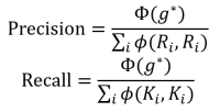 CEAF更关注实体之间的相似度,首先需要选择一种相似度函数φ(Ki,Ri)用来度量共指链实体的相似度。然后从K与R两个集合中较小的集合向另一个集合建立一一对应的映射并计算对应实体的相似度,得到相似度之和最大的映射g*称为最优映射,记Φ(g*)为最优映射相似度之和,则CEAF Presicion和Recall为: