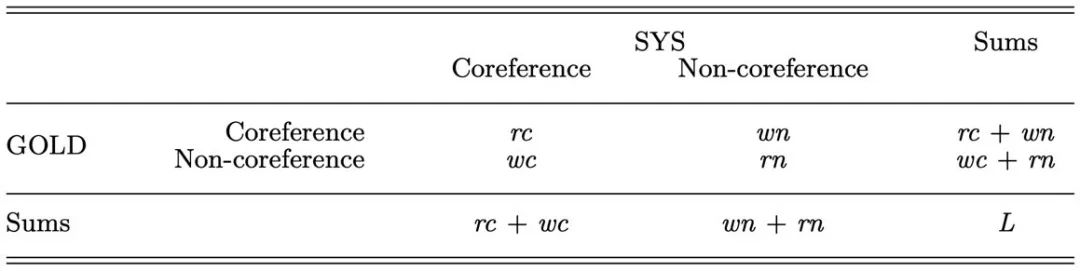指代消歧的常用数据集有CoNLL2012(包括144k个coreference,主题为新闻)和GAP(来自Gendered Ambiguous Pronoun Resolution,包含8908个coreference标注对)。在CoNLL2012上的评估指标为MUC、B-cubed、CEAF和BLANC几个指标的平均F值,在GAP上的评估指标为F值。本文将简要介绍CoNLL2012所用的几个评估指标。