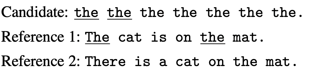 可以看到,candidate和reference的长度差异过大会影响n-gram评估的结果。因此,加入一个惩罚数BP(brevity penalty),下式中c代表candidate长度,r代表与c最接近的reference的长度。