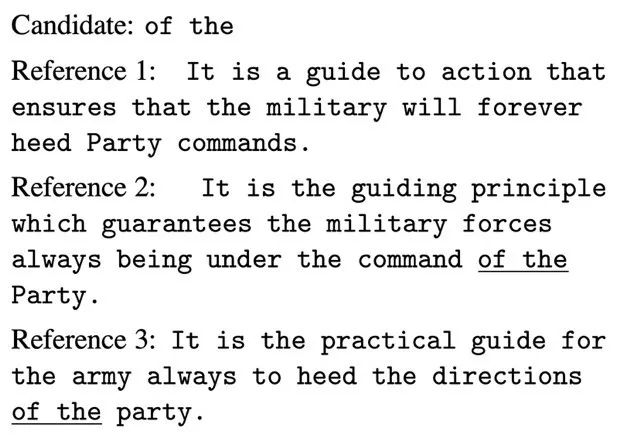 5.Papineni, K.; Roukos, S.; Ward, T. & Zhu, W.-J. (2001), BLEU: A Method for Automatic Evaluation of Machine Translation, in 'ACL '02: Proceedings of the 40th Annual Meeting on Association for Computational Linguistics' , Association for Computational Linguistics, Morristown, NJ, USA , pp. 311--318 .
