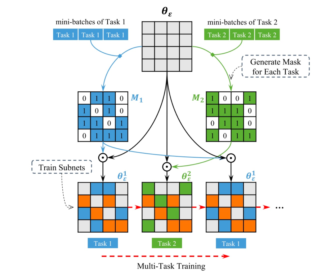 稀疏共享是2020年复旦大学邱锡鹏团队[4]在AAAI 2020上录用的论文中提出的方法,这是一种最新的参数共享机制,能够同时解决软共享、硬共享与分层共享的问题。稀疏共享可以为每个任务从基网络中抽取出一个对应的子网络来处理该任务,这些子网络部分重叠,算法可以为强相关的任务抽取出相似的子网络(具有较高的参数重叠率),为弱相关的任务抽取出差异较大的子网络(具有较低的参数重叠率)。得到这些子网络后,再使用多个任务的数据联合训练。